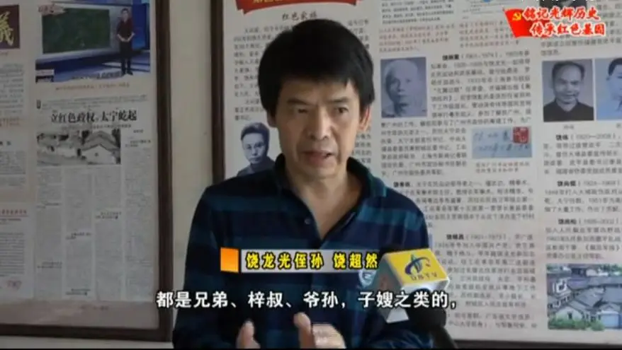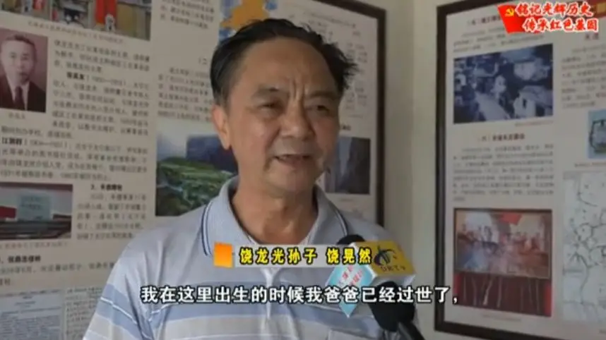 【饶龙光孙子 饶晃然:继承他的革命遗志,我在这里出生的时候我爸爸已经过世了,6岁就跟我妈嫁到青溪去了,但是我都记得,每年都会回来。小时候也是,走路回来。我们是革命家庭,所以要继承革命传统。我读书毕业后也去当兵,还参加了自卫反击战,然后我就回来了,家里就只有我自己,他们都在外面,我立志把革命家庭传下去,我现在也子孙满堂,把革命意志传下去。】